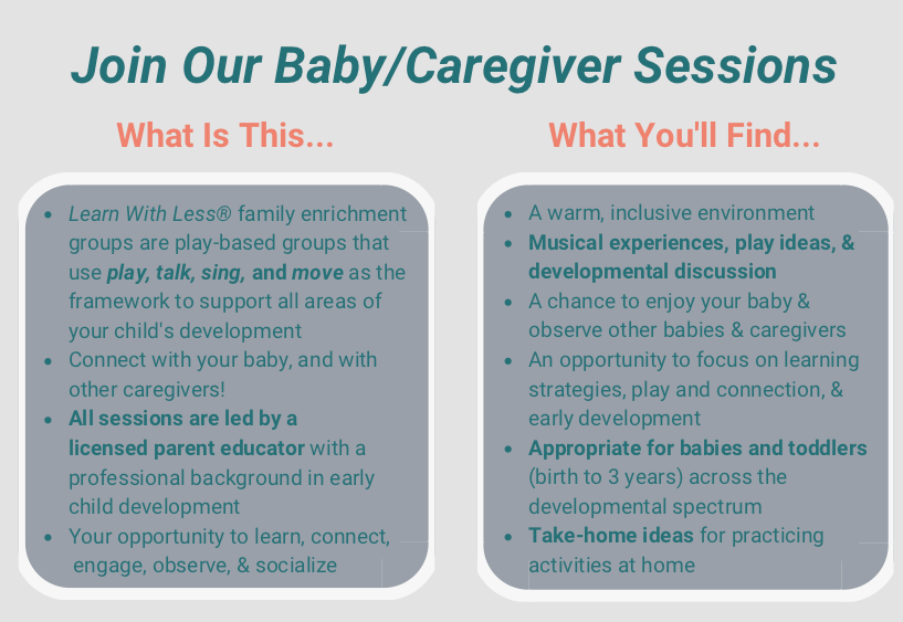 Each class provides opportunities for children ages 0-3 of all ability levels to interact and learn from each other and includes a Learn With Less® Lesson + Caregiver-Supported Free Play.